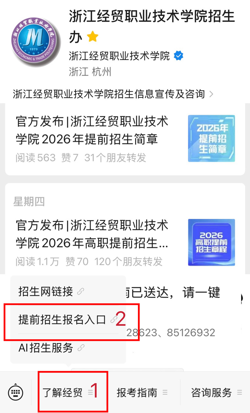 关注微信订阅号浙江经贸职业技术学院招生办(zjjmzs)后点击左下角的“了解经贸”中的“提前招生报名入口”