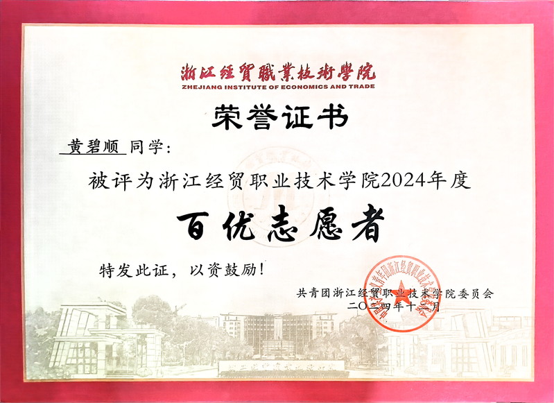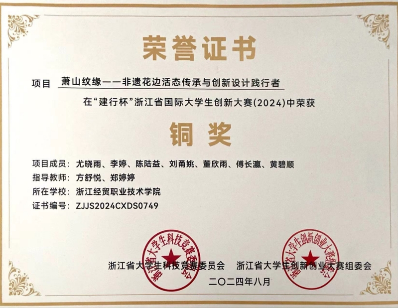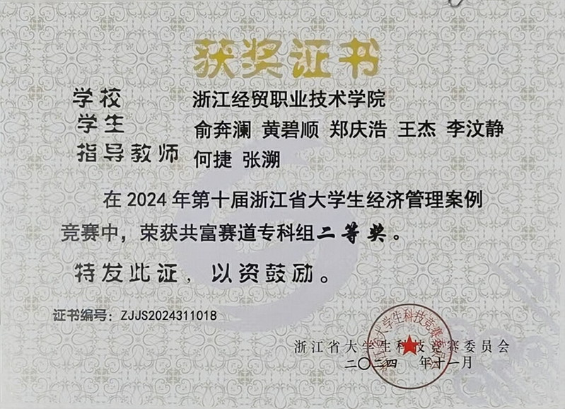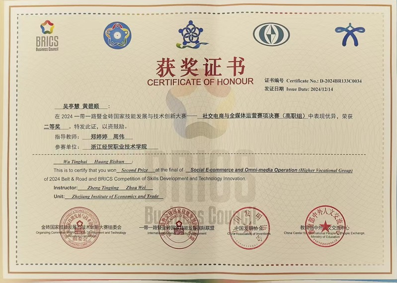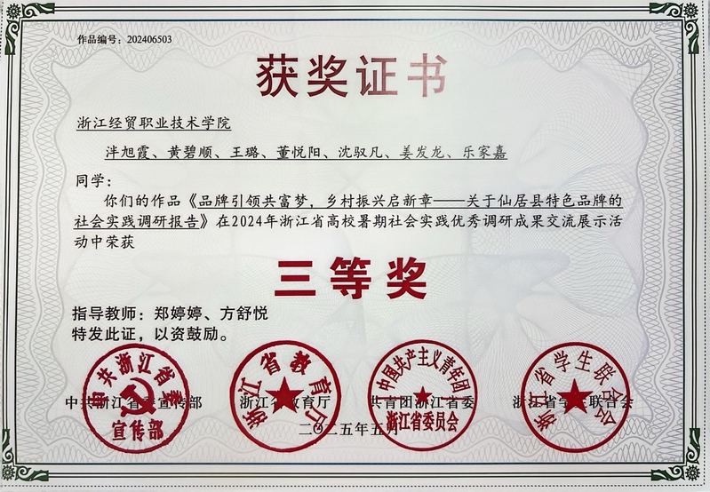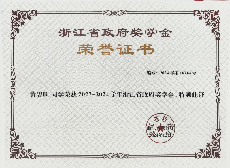 荣获2024-2025学年浙江省政府奖学金、“一带一路”暨金砖国家技能发展与技术创新大赛之社交电商与全媒体运营赛项全国总决赛二等奖、“建行杯”浙江省国际大学生创新大赛(2024)铜奖、第十届浙江省大学生经济管理案例竞赛二等奖;2023-2024学年浙江省政府奖学金、浙江省高校暑期社会实践优秀调研成果三等奖。