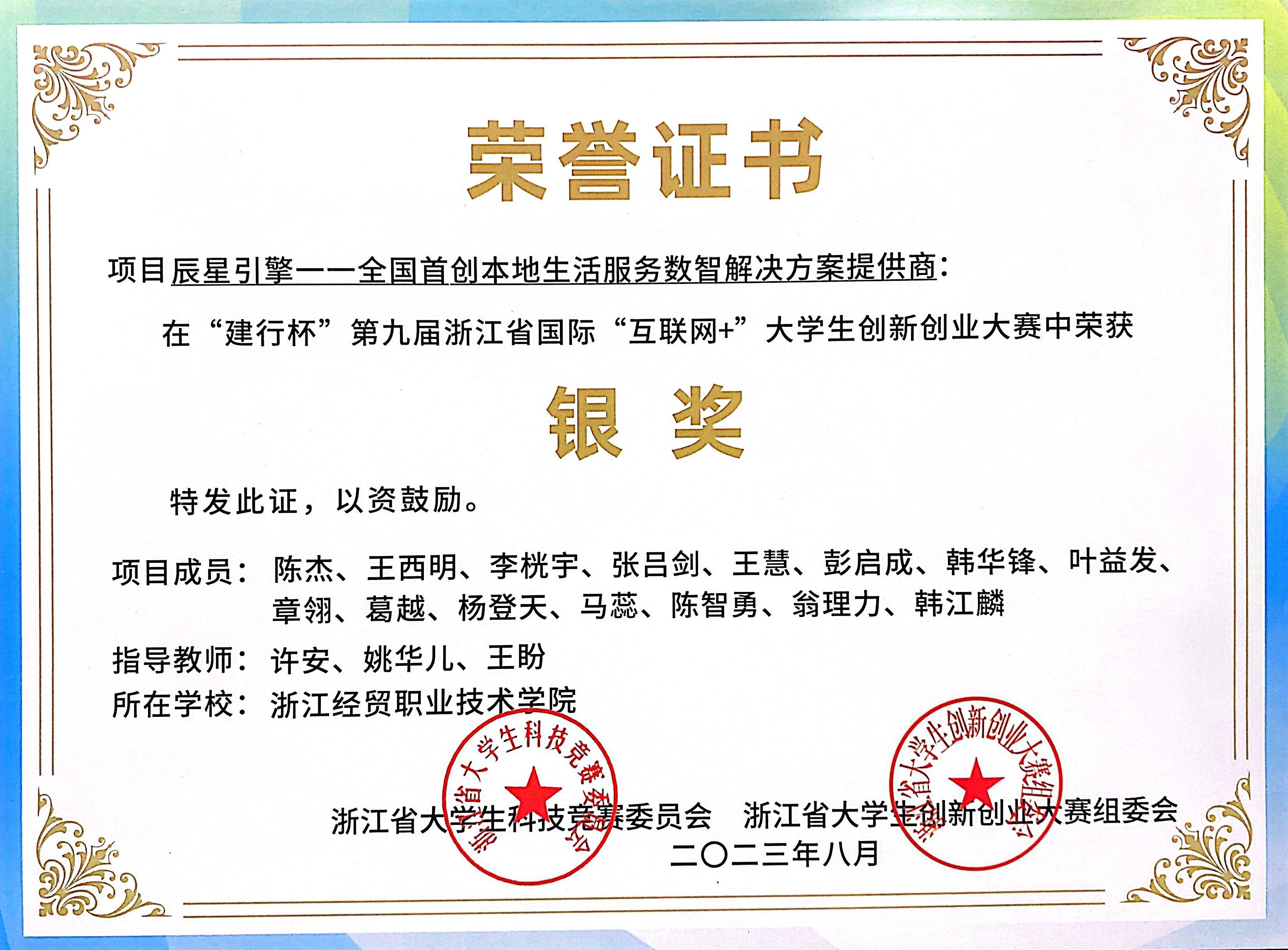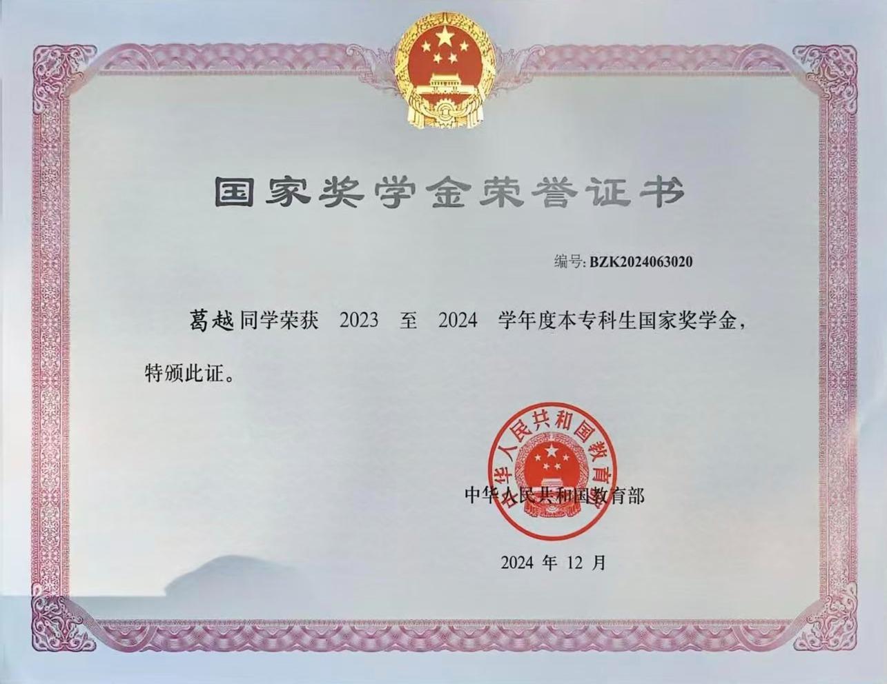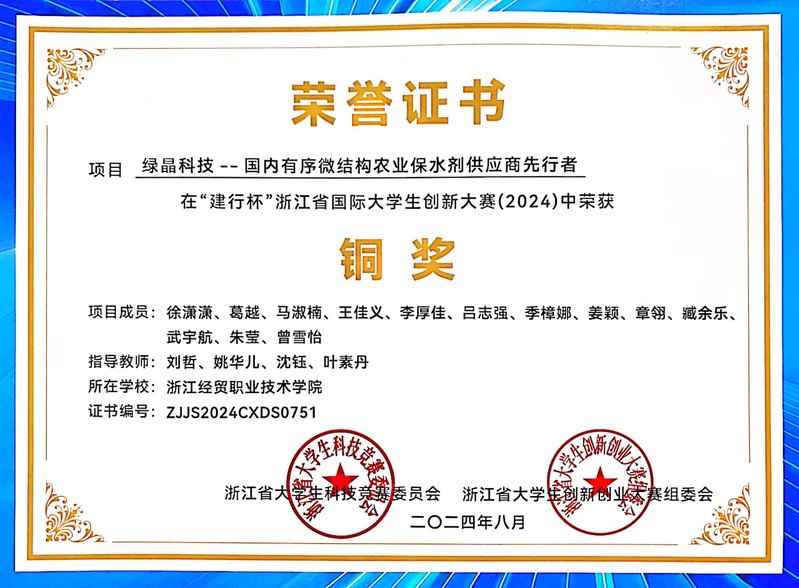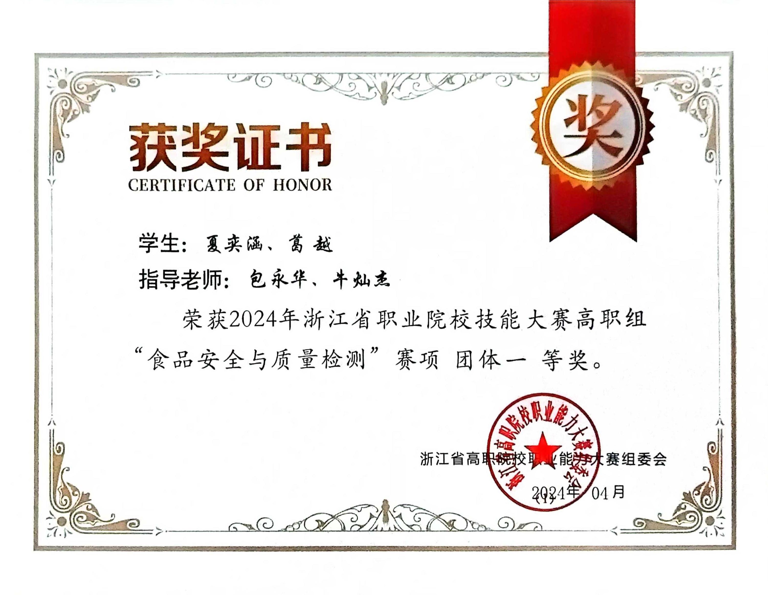 荣获2023-2024学年国家奖学金、浙江省国家奖学金特别评审奖;世界职业院校技能大赛总决赛银奖、“中行杯”浙江省职业院校技能大赛一等奖;大学生职业规划大赛就业赛道银奖、“建行杯”第九届浙江省银奖,入围中国国际大学生创新大赛总决赛;第六届“卡尔·马克思杯”浙江省三等奖、浙江省高校暑期社会实践优秀调研报告三等奖。