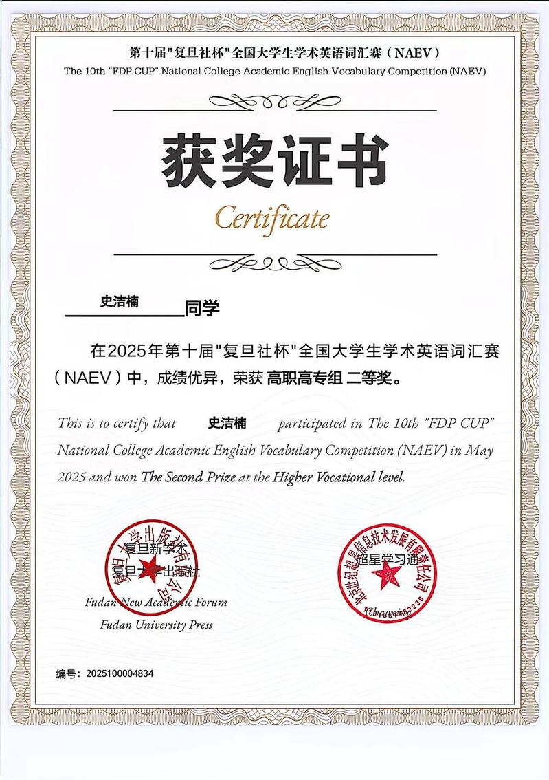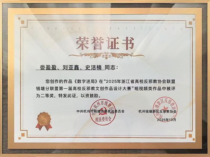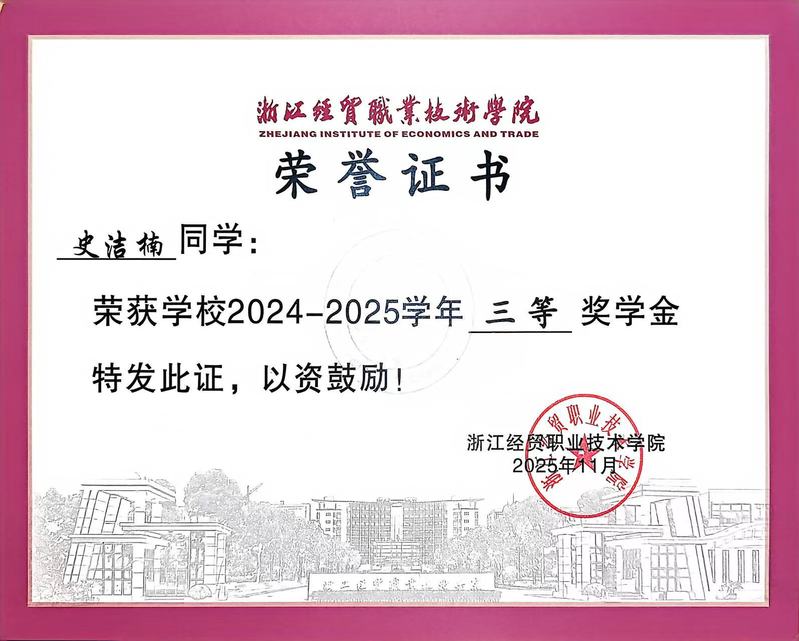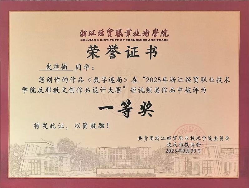 荣获2025年第十届“复旦社杯”全国大学生学术英语词汇赛(NAEV)高职高专二等奖、2025年浙江省高校反邪教协会联盟钱塘分联盟第一届高校反邪教文创作品设计大赛”短视频类作品二等奖、2025年浙江经贸职业技术学院反邪教文创作品设计大赛”短视频类作品一等奖、校三等奖学金、校三好生等。