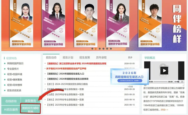 1.登录浙江经贸职业技术学院招生信息网(http://zs.zjiet.edu.cn/),点击“提前招生辅助系统”。